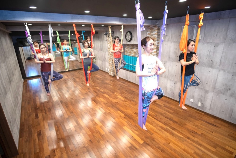 ティシューという柔らかい布で出来たハンモックを用いて行う空中ヨガ。